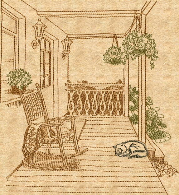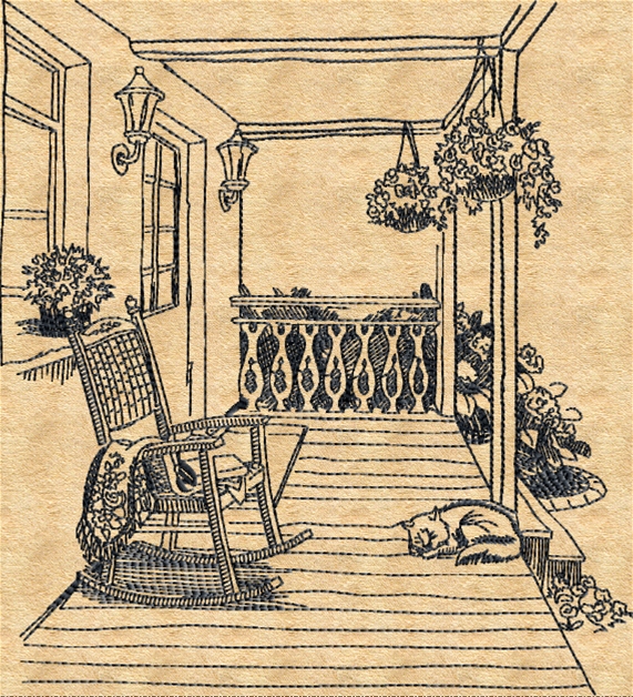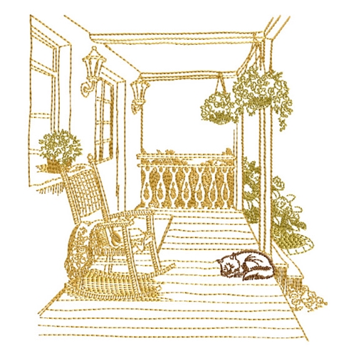 This Siesta embroidery design captures a peaceful porch scene with a rocking chair, plants, and a sleeping cat, all in a detailed sketch style. Ideal for cozy home décor and relaxing project themes.