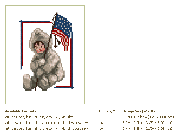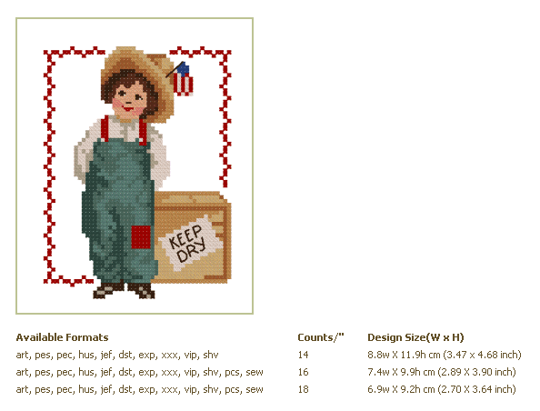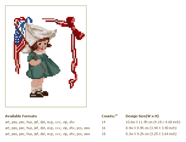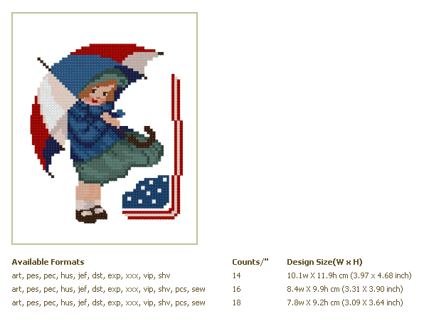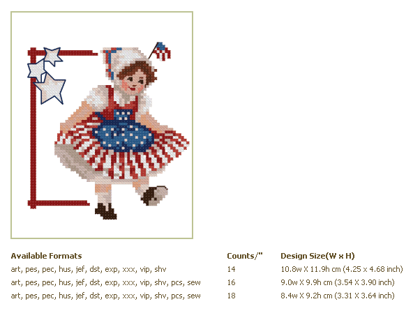 Formats: ART, PES, HUS, VIP, SHV, JEF, EXP, XXX, DST, VP3, SEW, PCS PDF-CHART