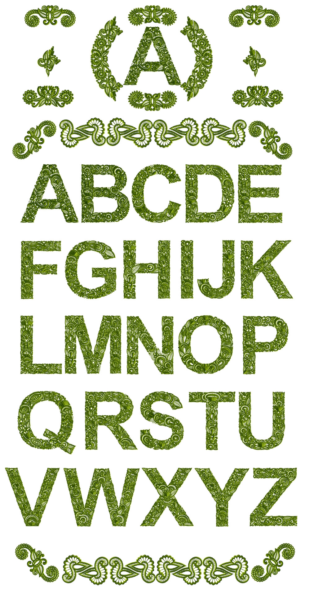 Set includes 63 Designs - All 26 capital letters in two sizes and Monogram Decoration Designs