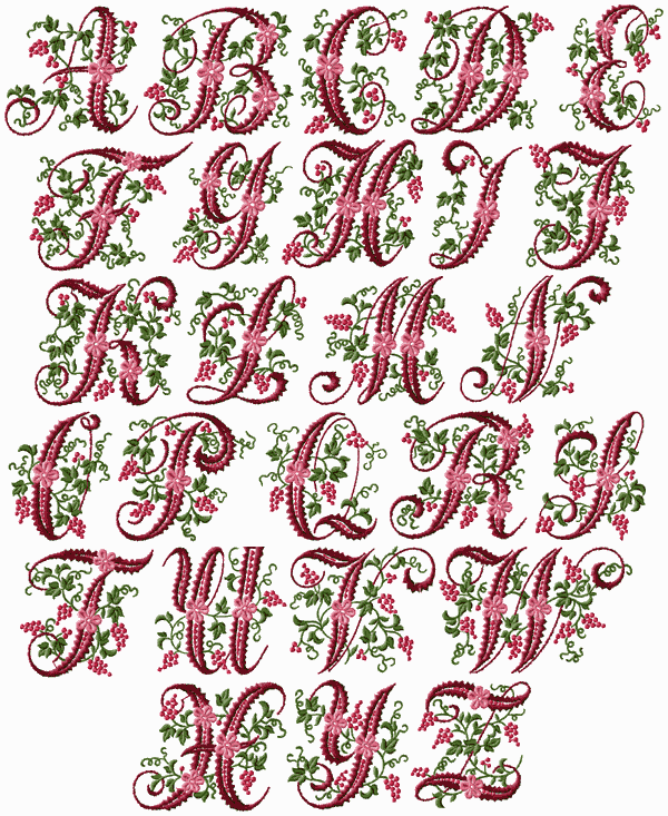 Curly Berries Font machine embroidery designs Hoop size: 4" x 4" hoop Maximum letter size: 2.65" Formats: ART, PES, HUS, VIP, SHV, JEF, EXP, XXX, DST, VP3, SEW, PCS Set includes: 26 Upper-Case Letters Delivery: Instant download. You can choose the CD delivery for an additional $8.60 at the checkout. This amazingly festive alphabet with berry vines will compliment a most lucrative project. It's great for towels, ladies fashion accessories and clothes. Just imagine a denim jacket with these initials on it's pockets! Natural Size: