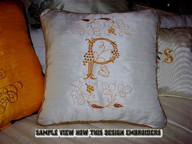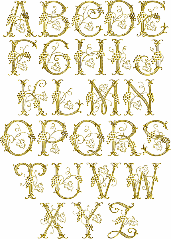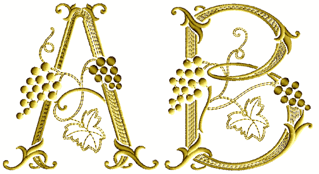 Grape Vines Font machine embroidery designs Hoop size: 4" x 4" hoop Maximum letter size: 3.88" Formats: ART, PES, HUS, VIP, SHV, JEF, EXP, XXX, DST, VP3, SEW, PCS Set includes: 26 Upper Case Letters Delivery: Instant download. You can choose the CD delivery for an additional $8.60 at the checkout. Grape Vines is antique style alpha, that is great match with "Grapes & Wheat" designs set. Perfect letters for embroidering light, elegant antique style monograms. Looks especially beautiful in metallic embroidery thread. Natural Size: