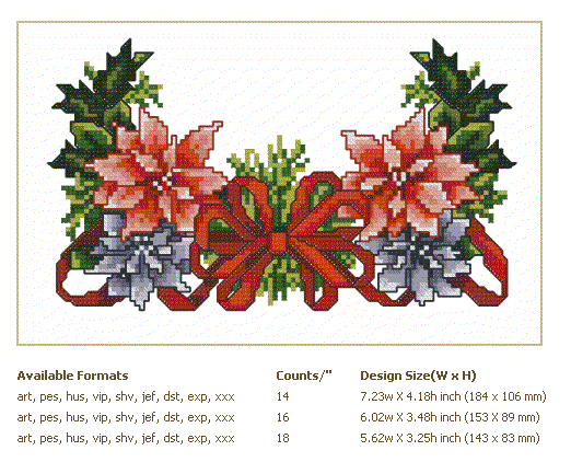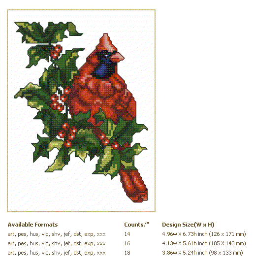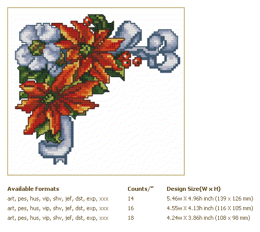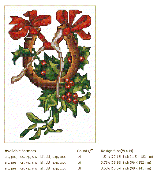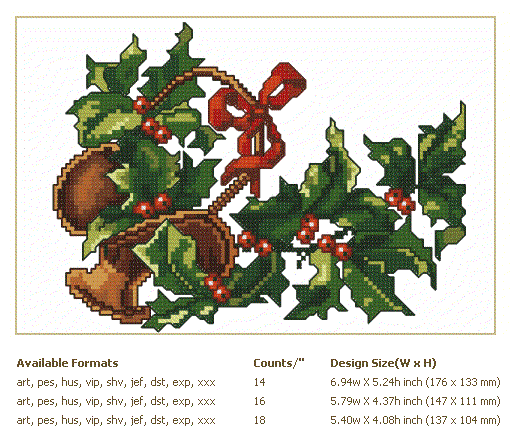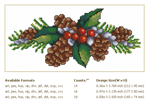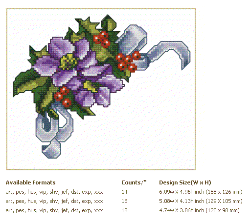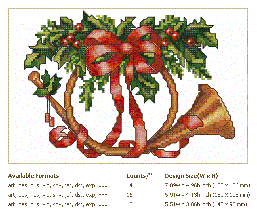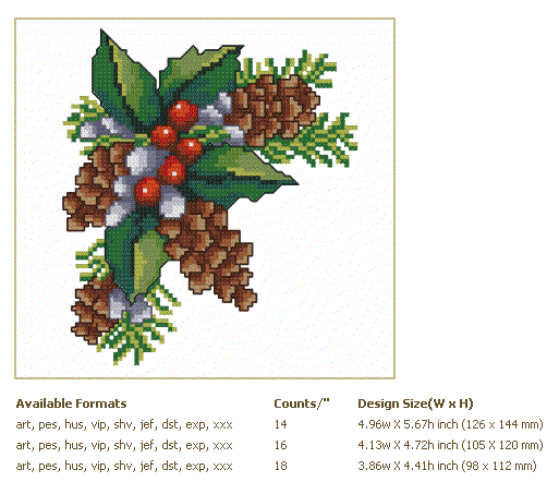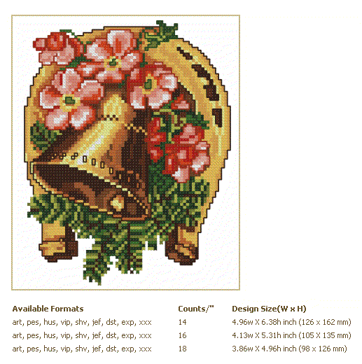 Formats: ART, PES, HUS, VIP, SHV, JEF, EXP, XXX, DST, VP3, CHART-PDF